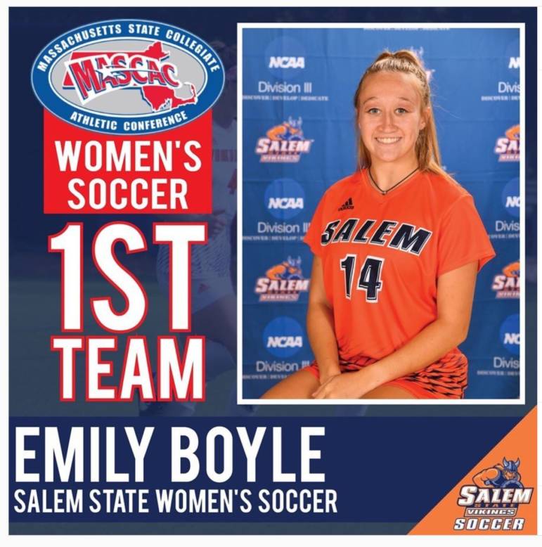 SALEM, Mass. – Manchester Central High School graduate and current Salem State junior Emily Boyle was named to the 2019 Massachusetts State Collegiate Athletic Conference Women’s Soccer First Team on Wednesday.