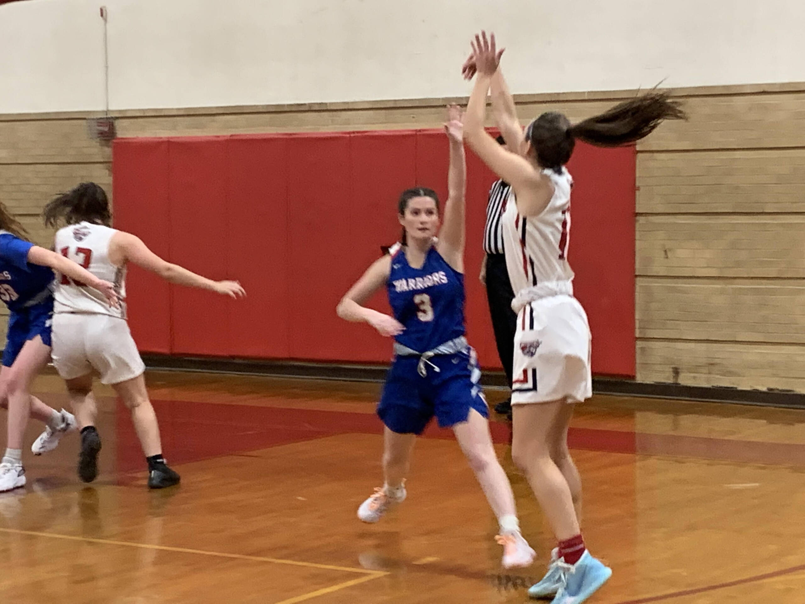 After a free throw by Bike made it 63-60, Goffstown had a chance to tie but Nyomah went high for a monster block on a 3-point attempt by Strand in the corner.