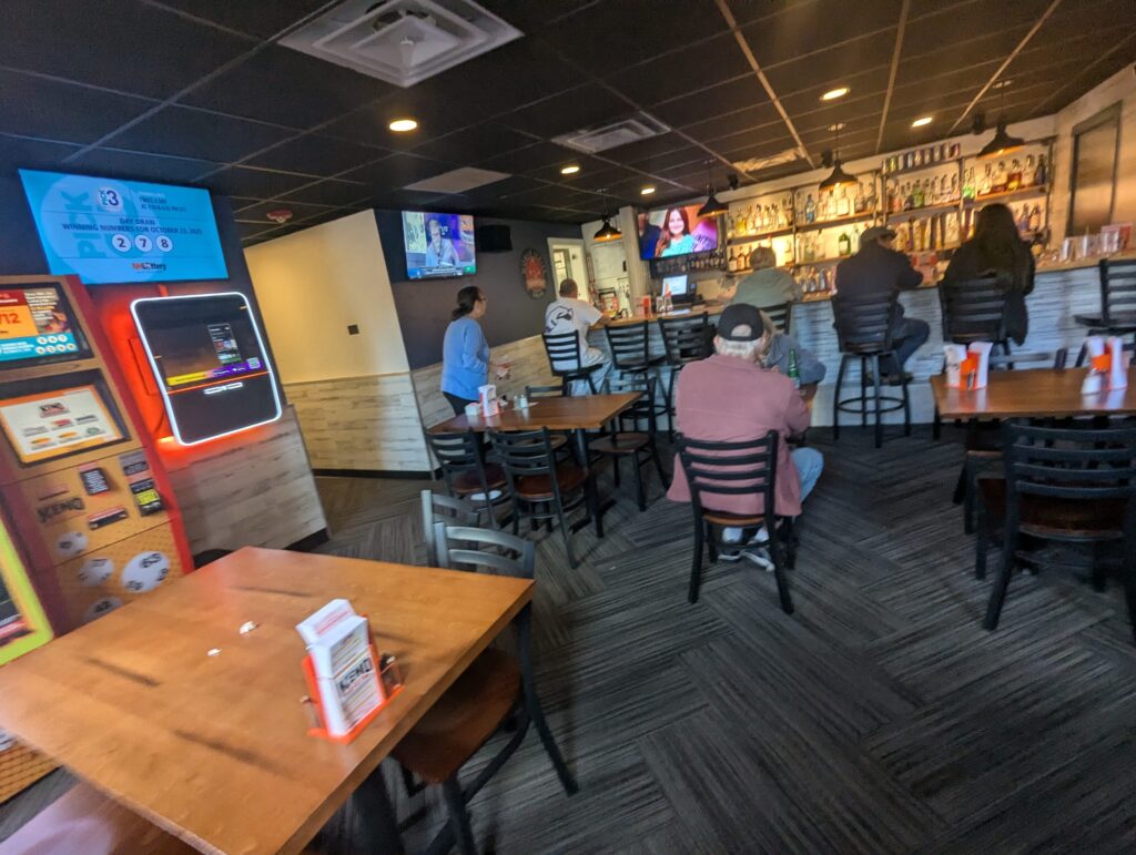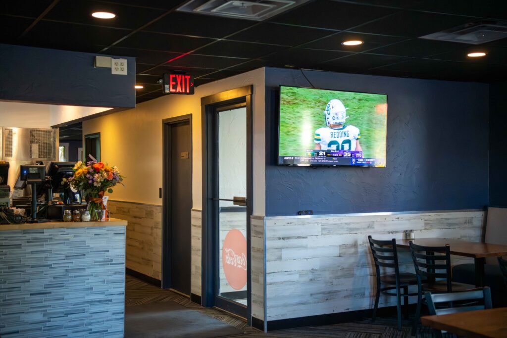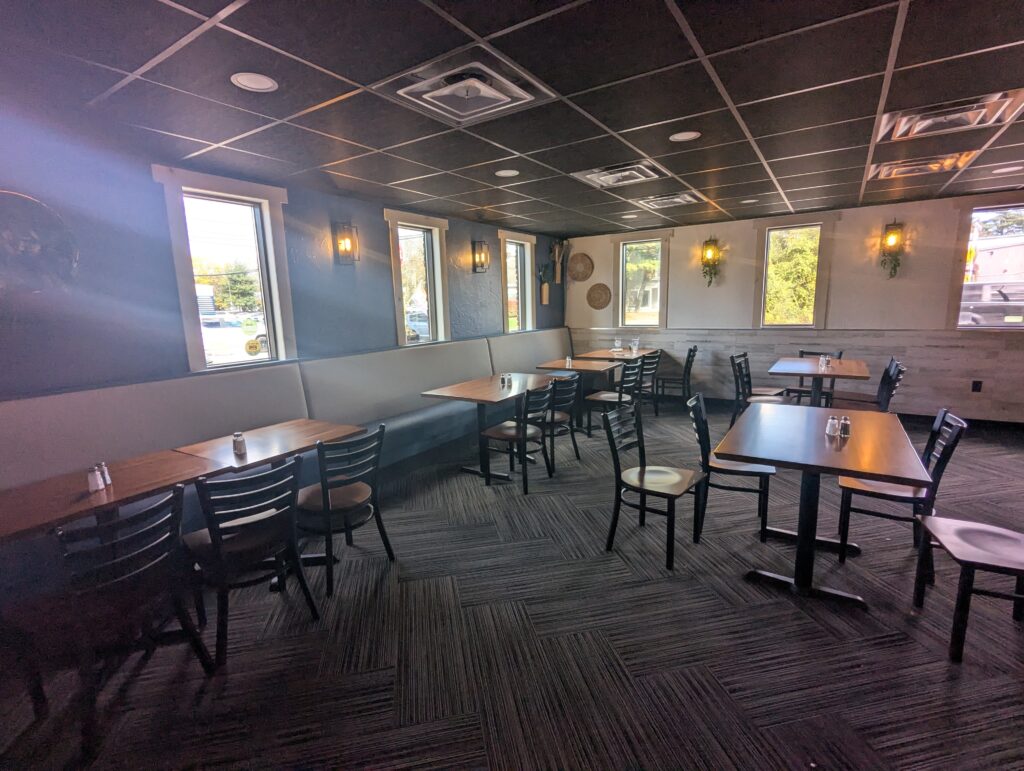 The overhaul involved replacing and upgrading the carpets, the tables—including a high-top table in the bar— new lighting, a new ceiling and new chairs and stools, as well as coats of fresh paint with a different color scheme and wainscoting.