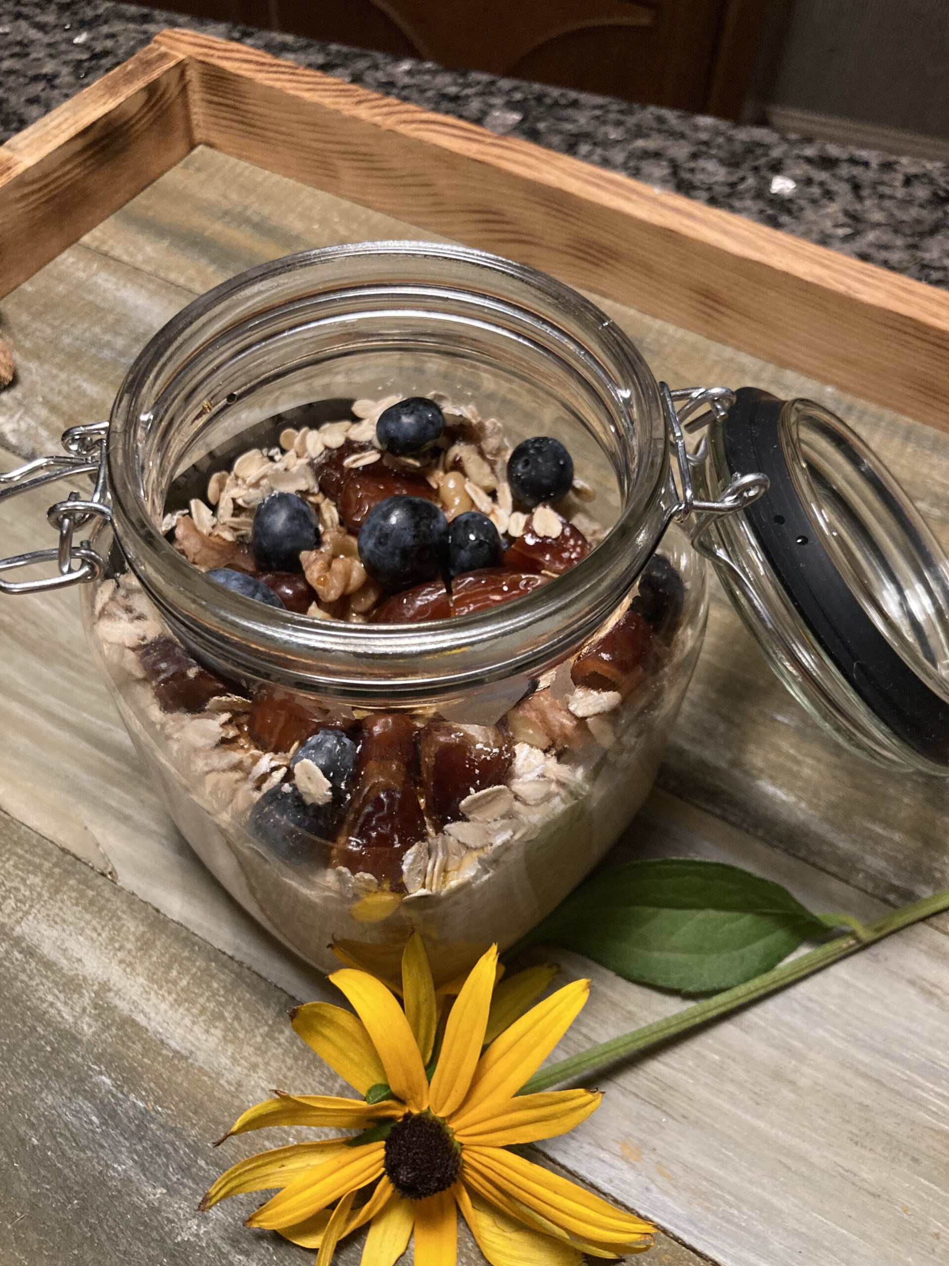 In a Mason jar or jar with twist lid, add ½ cup or 1 cup Organic Rolled Oats with equal amount plant-based milk and mix. (I use soymilk for high protein value.) Top with choice of fruit and nuts. I added dates, blueberries, and walnuts for anti-inflammatory properties with a swirl of pomegranate syrup for a dash of extra natural but nutritious sweetness. Place in refrigerator overnight and enjoy the next morning!
