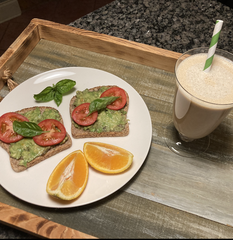 Avocado Toast with Tomatoes and/or Banana/Peanut Butter/Soymilk Smoothie