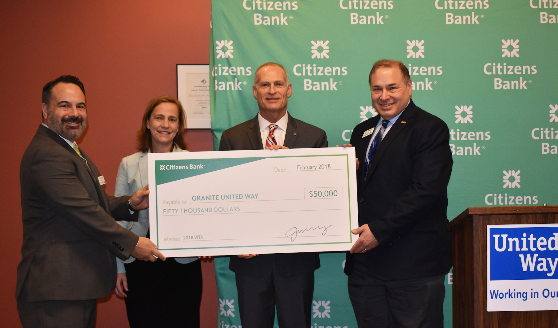MANCHESTER, NHย โ Granite United Wayโs Volunteer Income Tax Assistance (VITA) Program opened for free tax preparation sites with the help of a Citizens Bank $50,000 contribution from Citizens Bank to support the program. A formal check presentation launched the program on Feb. 1, 2018 at NeighborWorks Southern NH in Manchester.