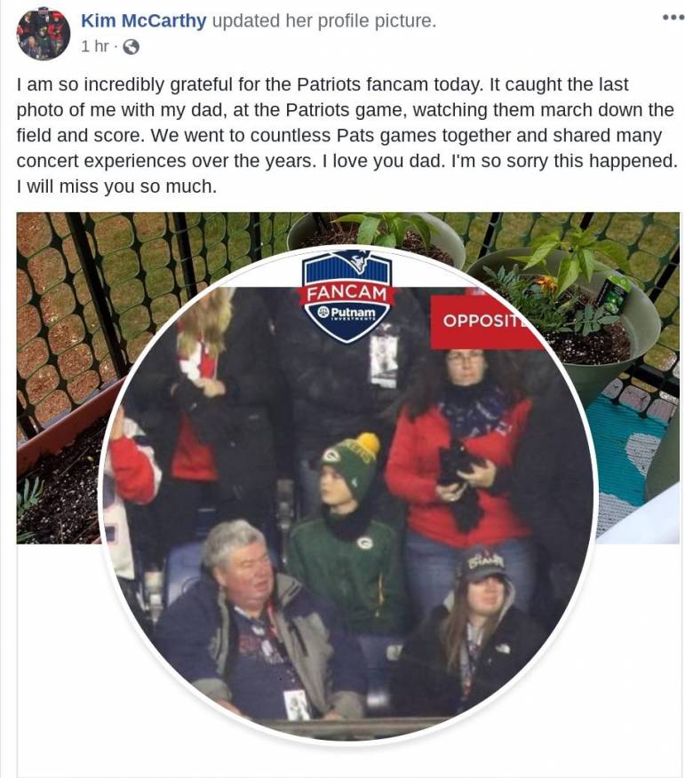 A bittersweet public Facebook post on Monday shared by McCarthy’s daughter Kim included a photo from the Patriot’s fancam, which captured a moment she will now cherish foreverย โ they were attending Sunday’s Patriots game togetherย โ McCarthy was a season ticket-holder. Her father suffered an apparent heart attack following yesterday’s game.
