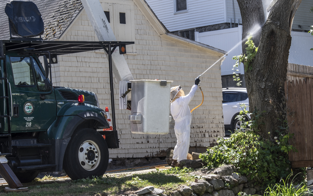 “I had to make a decision. We tried contacting a beekeeper, but we also made contact with an exterminator through Parks and Rec โ 603 Pest Control โ and we made the decision to exterminate the bees to avoid any further danger to the public. Then we removed the hive from the tree, transported it with the bucket truck to be buried,” Poulin says. “They did a professional job. We talked about our alternatives, but because of the hazard to public with the swarming bees, we used chemical spray to exterminate them. We had a lot of onlookers and I didn’t want anyone else getting stung or going into shock.”