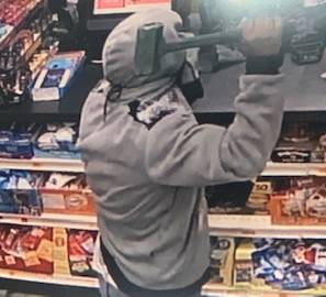 At 7:25 a.m. on Jan. 8 a man entered the store and, holding a mini-gun and a sledgehammer over his shoulder, demanded cash from the clerk.