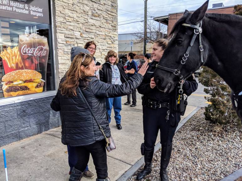 Loretta Crenshaw of Easter Seals greets Valor the police horse, as Officer Kelly McKenny talks about how the city’s mounted patrol operates. Photo/Carol Robidoux