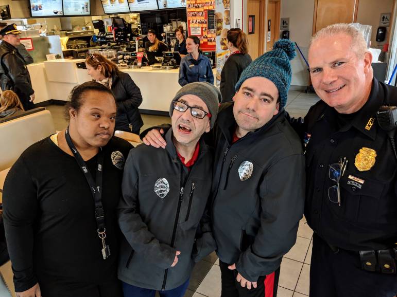 Among those who made a special trip Thursday to interact with the officers was Loretta Crenshaw of Easter Seals, who normally takes clients to the Brown Avenue McDonald’s for some daily social interaction.
