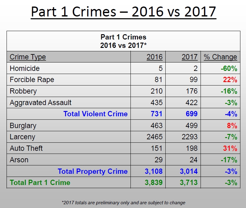 The Crime Index is composed of selected offenses used to gauge fluctuations in the overall volume and rate of crime reported to the police. The offenses included are the violent crimes of murder, rape, robbery and aggravated assault; and the property crimes of burglary, larceny, theft and arson.