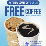 read more…: How to get free coffee on National Coffee Day at Aroma Joe’s (+ enter to win a dream vacation)Aroma Joe’s is celebrating National Coffee Day on September 29th with a FREE 16-ounce Hot or Iced Coffee for all guests.* AJ’s Rewards members have even more to celebrate and will receive one FREE 24-ounce Hot or Iced Coffee reward to be used from September 29th – October 6th. Â