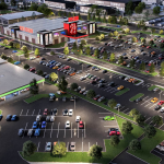 The proposal now includes replacing the existing parking lot with up to 150 residential apartments in a 5-story structure, twelve (12) 3-story townhouses, and 296 parking spaces in a two-level parking deck.