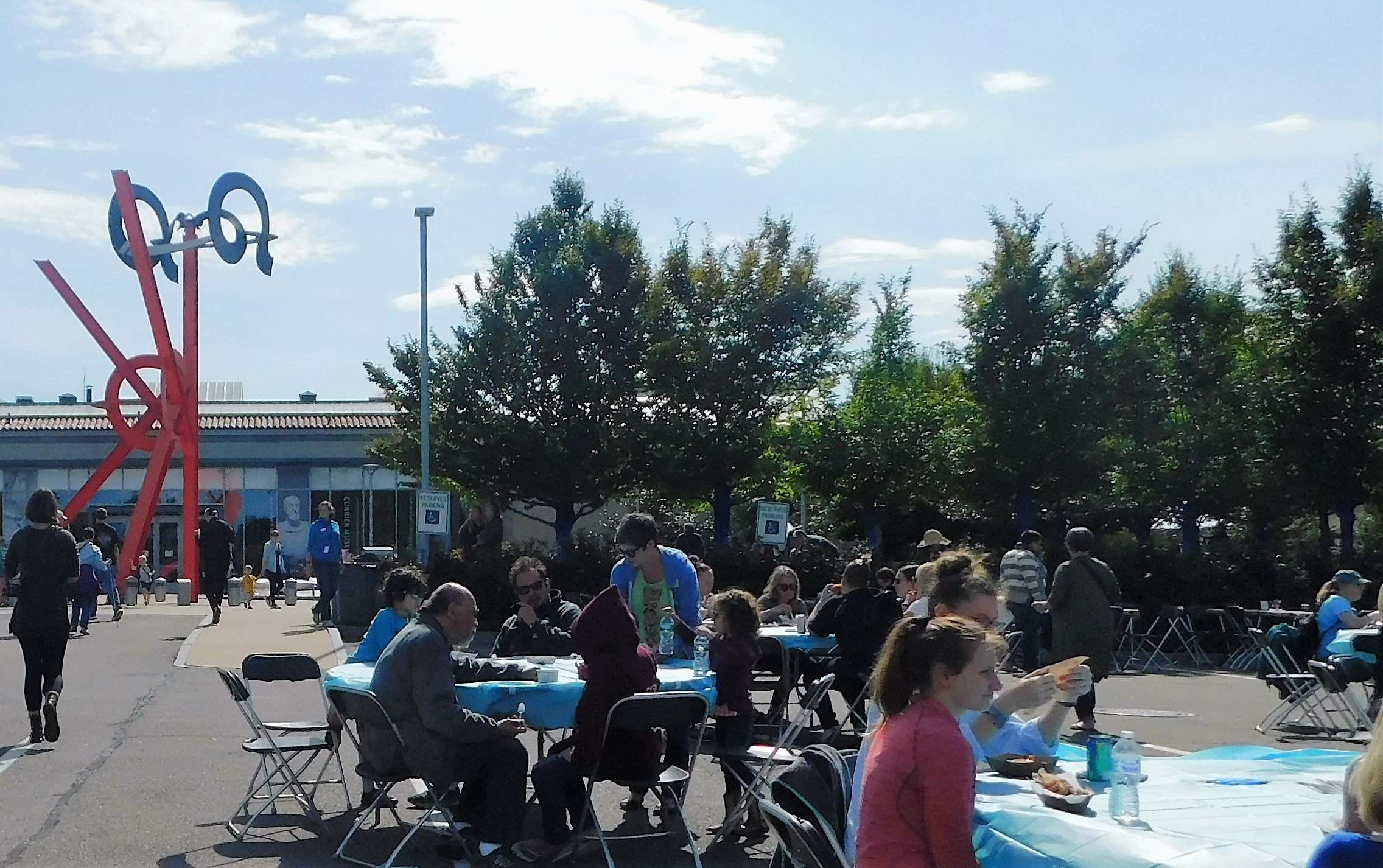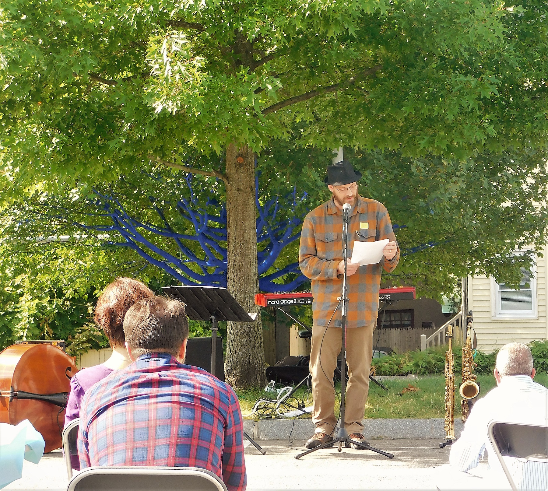 The community event featured art-making, live music, food trucks, and poetry. The Manchester Bookmobile was on hand with free books for the family and there was face painting for the kids. Attendees were also able to participate in the creation of the installation by coloring trees.