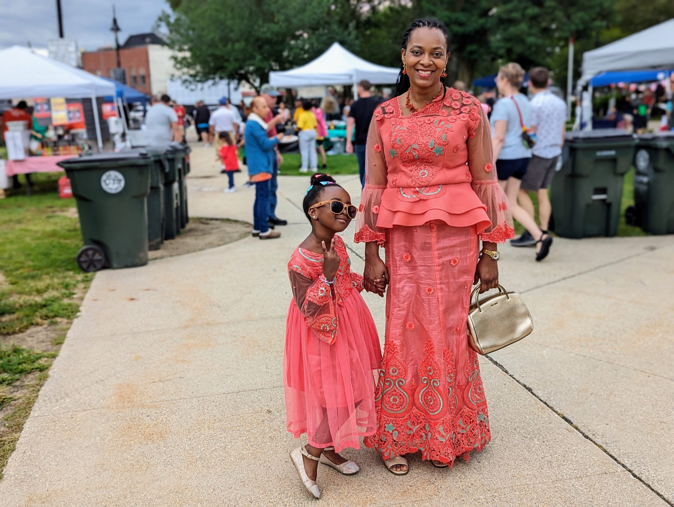 Bukola Adejumo was hard to miss as she made the rounds with her daughter, Victoria, 6, in matching mother-daughter dresses.