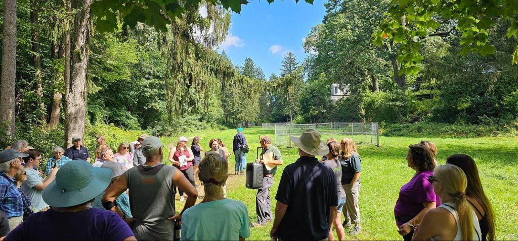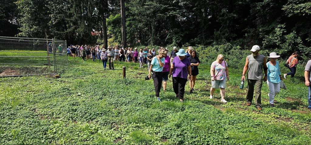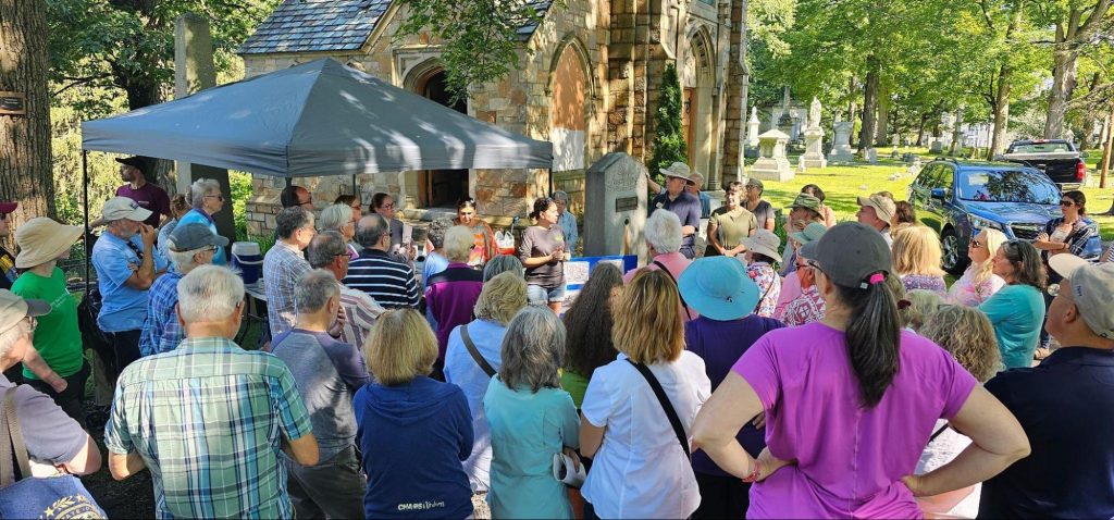 Over 75 people participated in the tour which started at the Valley Cemetery Chapel and made its way down into the center valley of the cemetery before making its way back up by way of the recently cleared “east stairs.” Along the way tour participants heard from various people who are working hard to restore this green space.