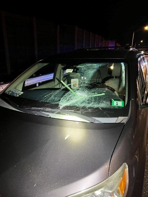 Three vehicles passing under the Queen City overpass traveling southbound sustained smashed windshields and additional damage as a result of four-foot lengths of rebar, shovels and concrete that had been thrown from the bridge and onto the interstate. The bridge is currently under construction but was not an active work zone at the time of this incident.
