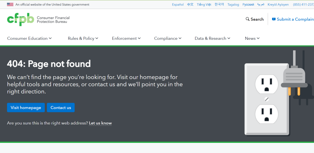 As of this writing, if you go to the CFPB’s website, you get an error page, though all its tabs and links still seem to be working and its information is still intact.
