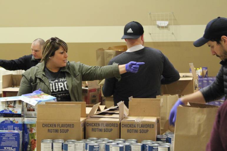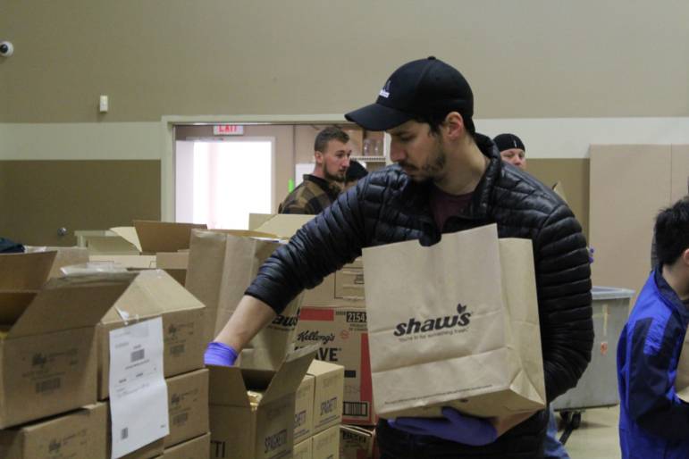 Shayne Murphy packing up food using bags donated by Shaw’s Supermarket. Courtesy Photo