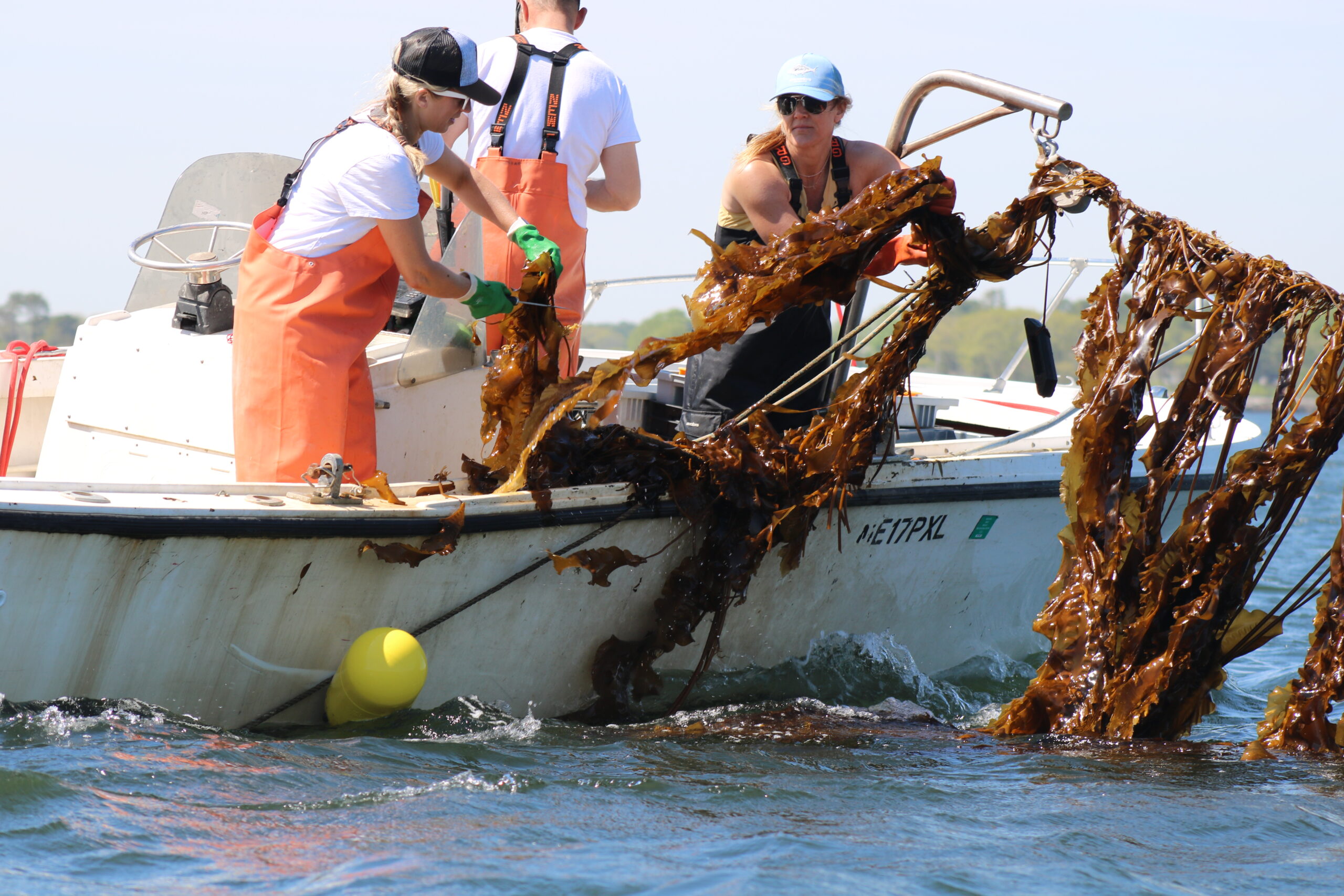 One sunny Friday morning in May, Potter and Rosen, owners of Cold Current Kelp, traveled to Pepperrell Cove for their second kelp harvest of the spring season. In a few weeks, they need their lines to be completely removed to make room for summer activities on the water. Geared up in rubber gloves and bright orange fishing overalls, the two remove kelp off the lines by hand, hauling rope up from the water and carefully using a machete to slice it off. Then, they pack it piece-by-piece in storage containers. Working against the wind and the beating sun, the process can take hours.ย