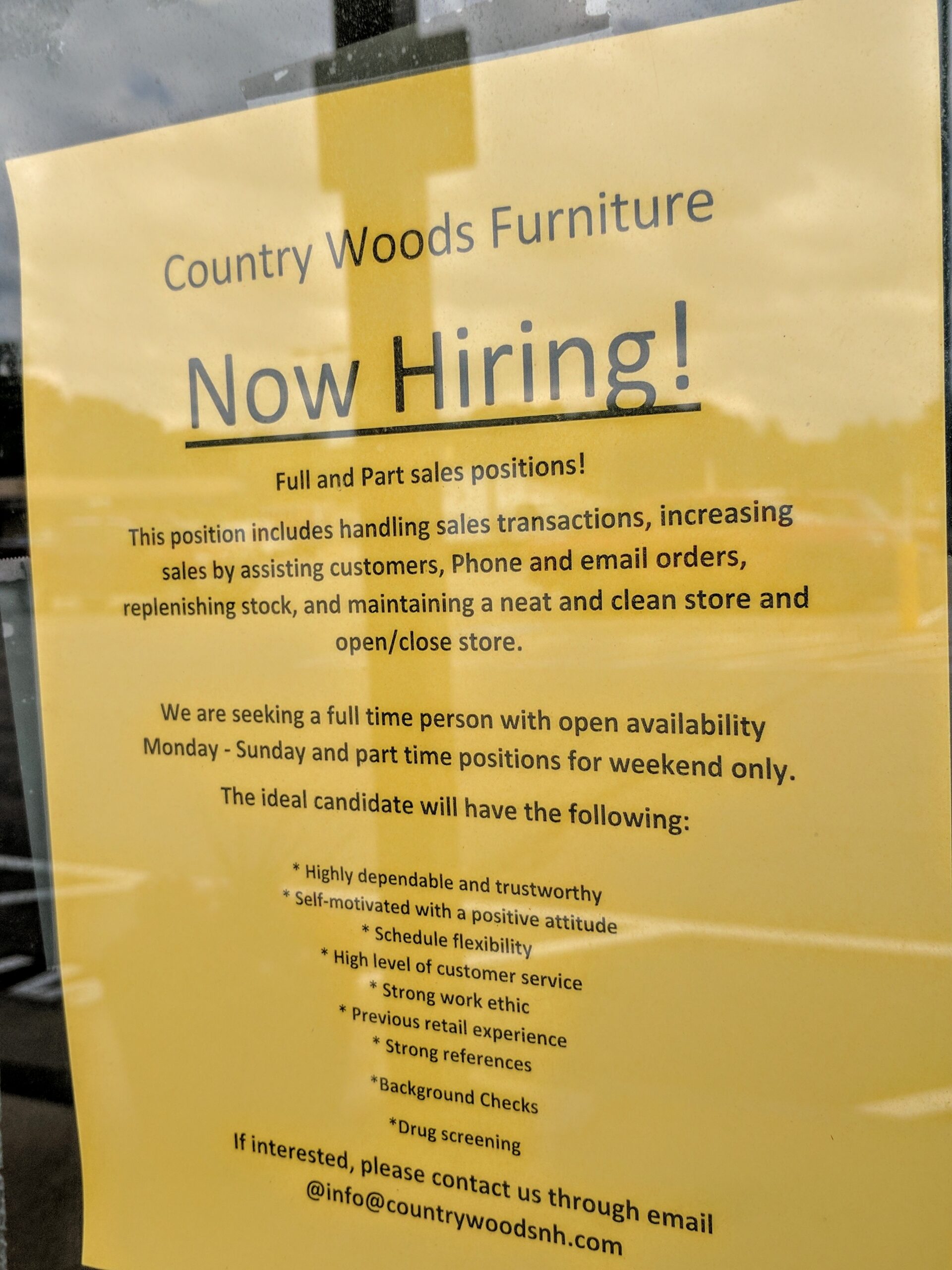 A help-wanted sign was visible on the door at the East Side Plaza. Cavanaugh says yes, they’re always looking for good sales people โ particularly those with furniture sales experience. The positions advertised are for full-time Monday – Sunday, and part-time weekends only.