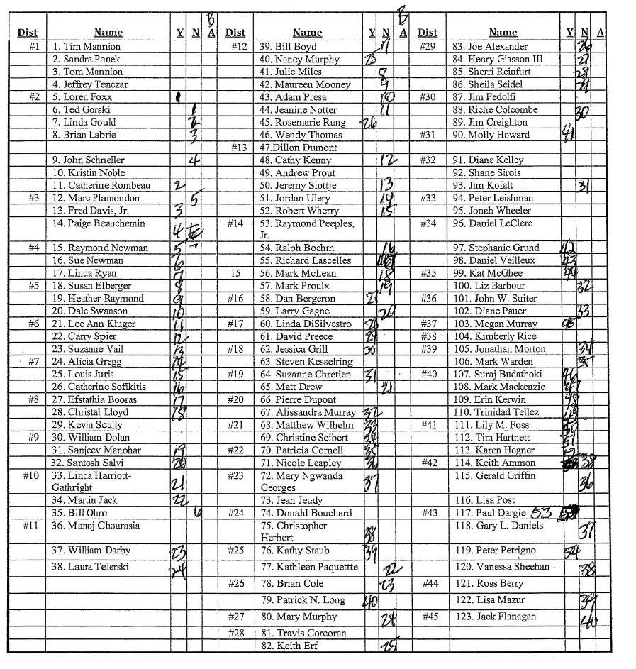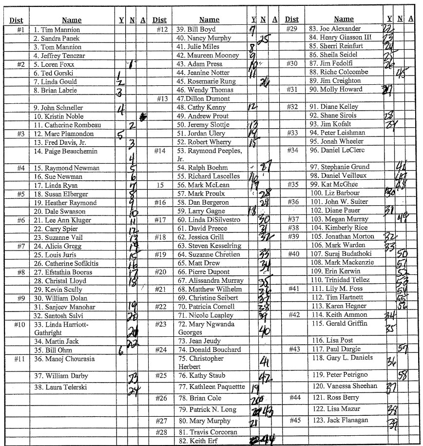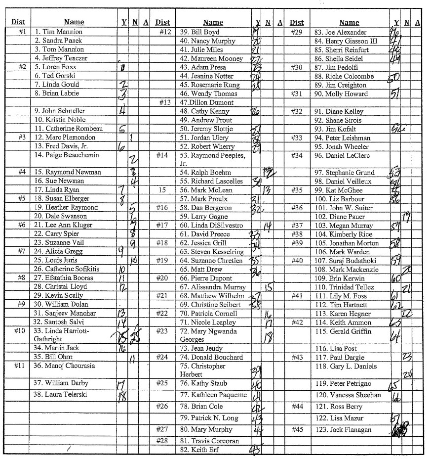 An initial motion to reduce that funding was found to be out of order as it had to align with a specific line item and reduction amount in the budget. The total cost savings was calculated at $12,000 and another motion was made by Jeremy Slottje (R-Hudson) using that amount and the specific line item in the budget, with a roll call vote on the item passed 67-24 (see list below). However, Darby noted that under state law, another motion would be needed to suspend the rules of the convention to allow this motion, as under New Hampshire Revised Statute Annotated Chapter 24:9-ee, the members of the convention were legally entitled to the money and the previous motion would have technically violated state law without the suspension of the rules. This motion passed on a 72-2 division vote.