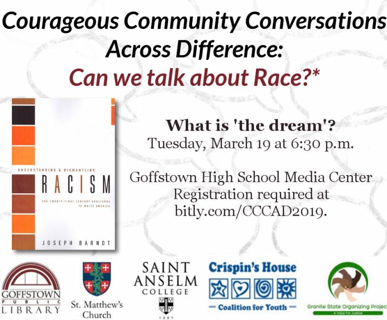 Join this facilitated conversation exploring the “dream” as articulated by Dr. Martin Luther King and described in the book “Understanding & Dismantling Racism” by Joseph Barndt. During the conversation, we will discuss what the “dream” might look like in the Greater Goffstown community. Registration is required at http://bitly.com/CCCAD2019.