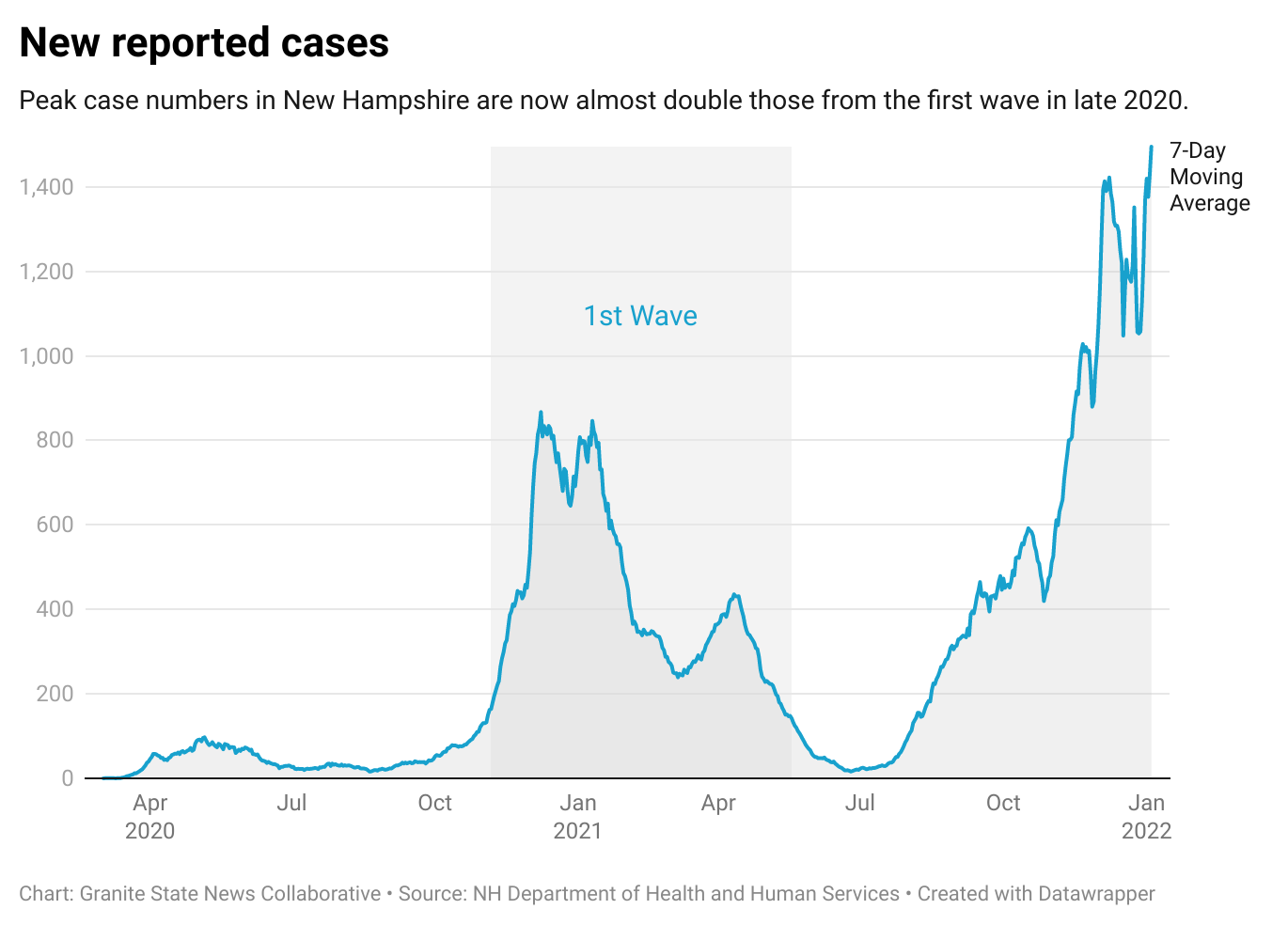 The latest surge has pushed daily case numbers to all-time highs. The seven-day moving average for new daily cases in NH had fallen in the first half of the year, bottoming out at just 16 at the end of June, but has quickly risen since then. After dropping slightly in mid-December, the state is now averaging roughly 600 cases per day more than it was at the height of the first wave in December 2020.