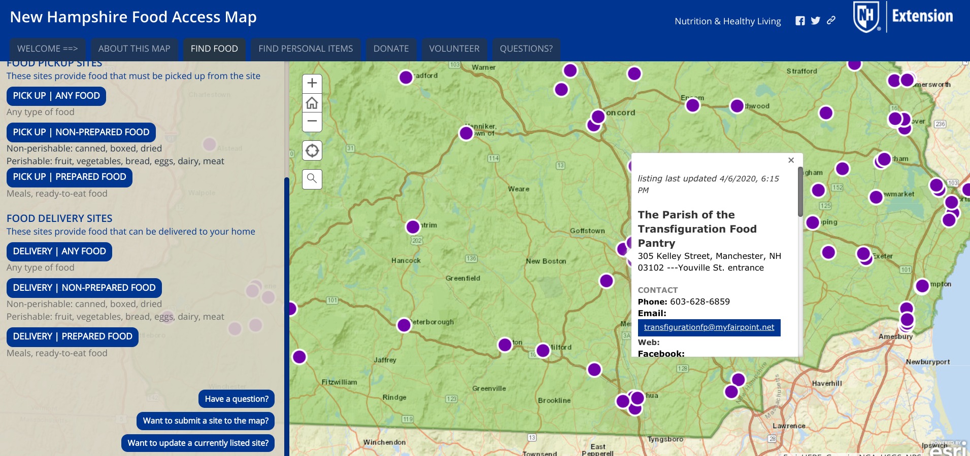 New Hampshire Food Access Map โ A central resource for those needing food or personal items, and for those looking to donate or volunteer in their community.
