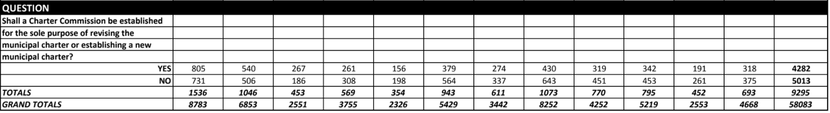 Voters voted down the poll question, which asked if there should be a charter commission established to either revise the existing city charter or to establish a new one, with 4,282 voting “yes,” and 5,013 voting “no.”