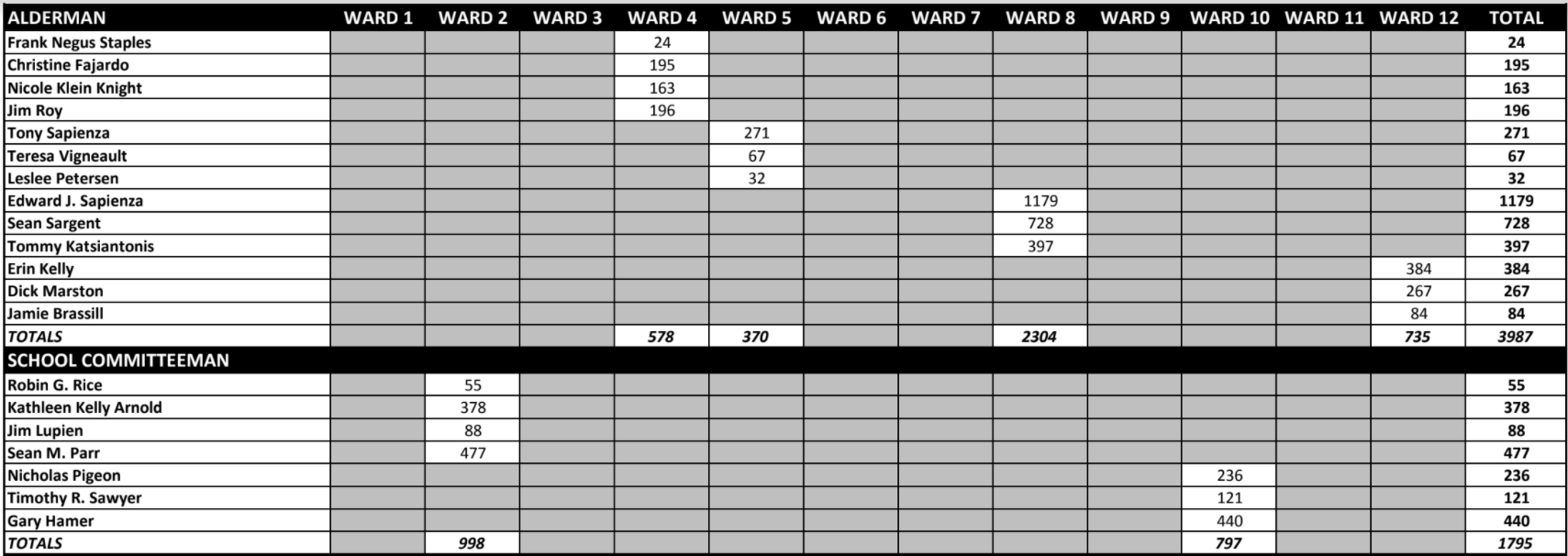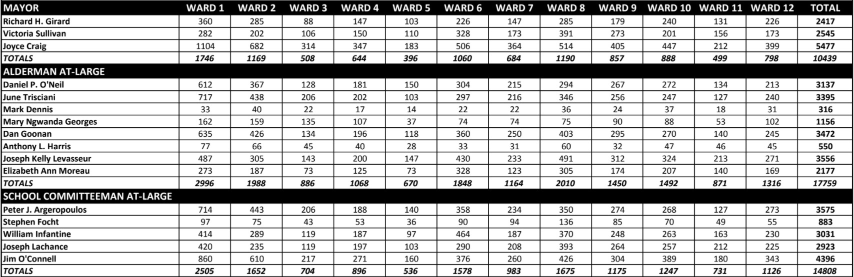 Below are the full unofficial election results issued late Tuesday night by City Clerk Matthew Normand.