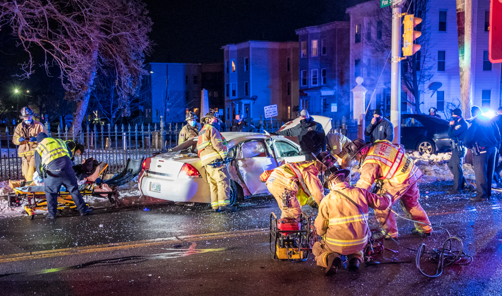MANCHESTER, NH โ An accident at Valley and Pine streets required rescuers to cut through the wreckage to remove injured parties from one of the vehicles.