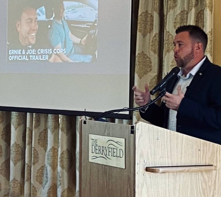 Smarro, co-star in the HBO documentary “Ernie and Joe: Crisis Cops,” was the featured speaker at the Derryfield presentation. The film follows Smarro and his partner, Ernie Stevens, members of the department’s Mental Health Unit, as they respond to crisis calls. In one incident, they talk a woman out of jumping off a bridge. Voices, she said, told her to “Jump. Jump. Jump.”