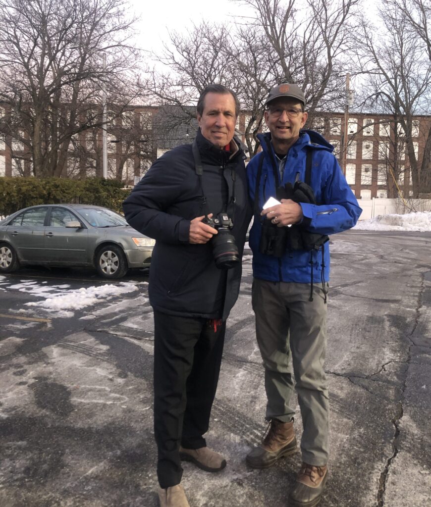 Gibson, who began photographing and documenting crow roosts in Lawrence, MA, in 2017, had driven up to witness Manchester’s own fall and winter assemblies of these loud and gregarious birds. He joined local bird aficionado Mark Timmerman and the author at a parking lot near Bridge and McGregor streets. Timmerman has been keeping tabs on local crow movements for about seven years; his observations convinced Gibson to pay a visit to the Queen City. An experienced observer of hawks and waterfowl, Timmerman had recently counted 7,800 crows passing over the Amoskeag Fishways on their way to their night roost.