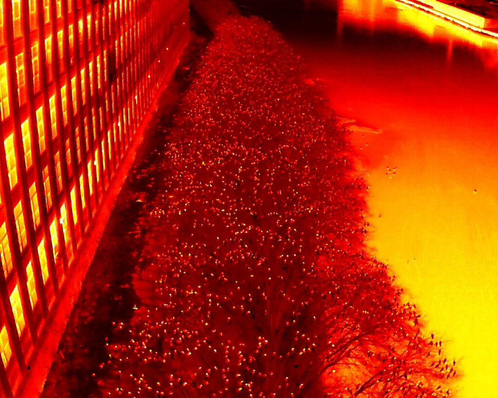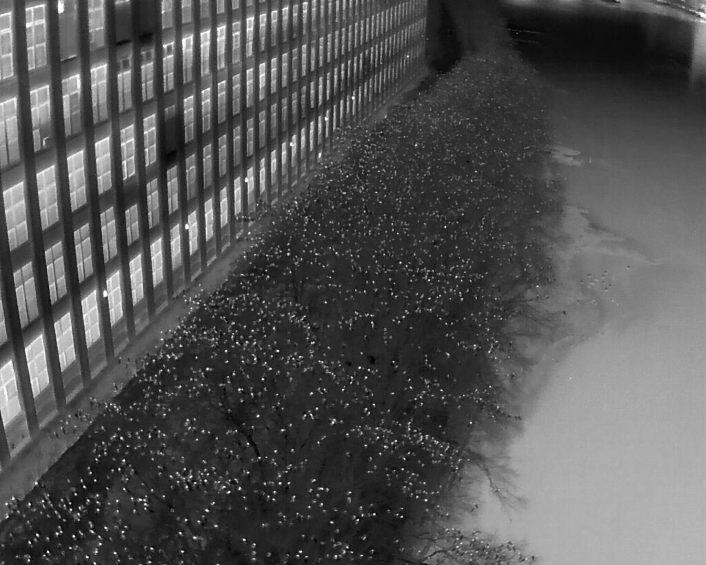 He estimates that he has spent “thousands of very enjoyable hours over the past nine winter seasons and off season as well” studying the crows, and that “the investment in gear has paid huge dividends as we’ve been able to deploy all kinds of imaging tools to achieve ground-breaking results. The night vision gear and thermal drones have helped us with major new insights after dark with documenting roost movements, counting efforts, and increased public understanding.”