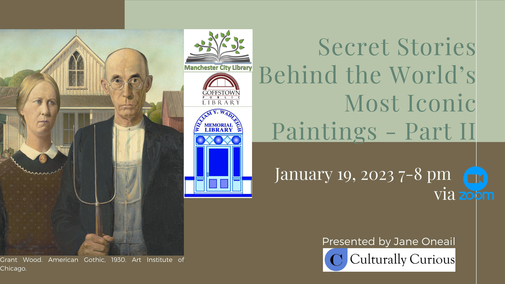 From American Gothic to Whistler’s Mother to Nighthawks, there are some images that are so ubiquitous in our culture that we have stopped looking at them closely. This program delves into these iconic works and shares the secret stories behind their creation and reception.