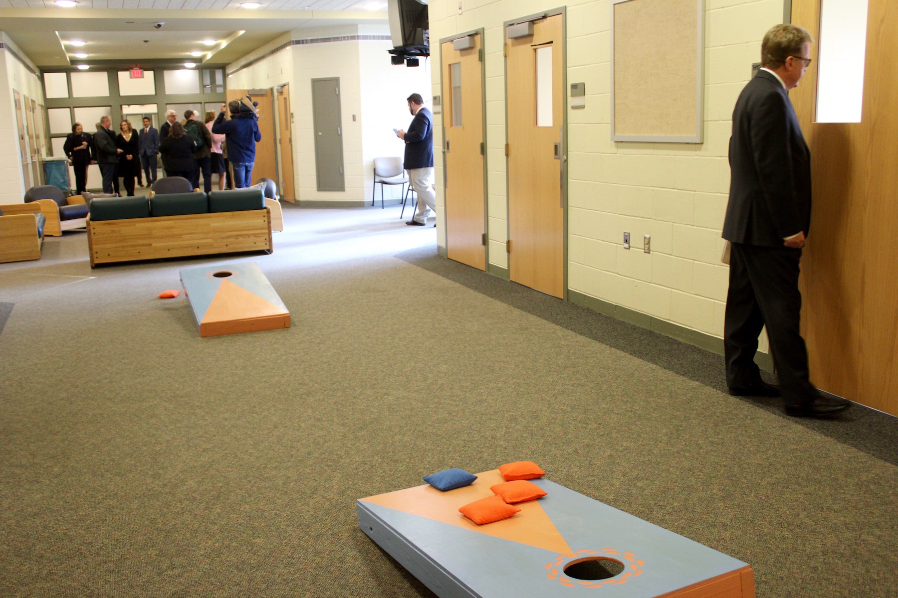 “You are desperate when your kid’s addiction is driving the bus,” he said. “You’ll do anything to try and get them help, to get them a bed in any mental health facility or in detox. There’s just not a lot of programs for them.”Cornhole is set up near the sleeping pods during the Oct. 2018 ribbon-cutting tour of Granite Pathways Youth Treatment Center. Photo/Carol Robidoux