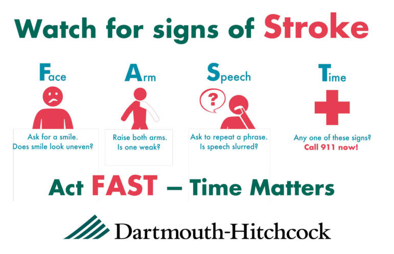 In honor of World Stroke Day, DHMC encourages everyone to know the signs of stroke: F.A.S.T Face drooping, Arm weakness, Speech difficulty, Time to call 911. Time is of the essence when a patient suffers a stroke. Even if their symptoms go away, it is important to take them to the hospital for immediate treatment.