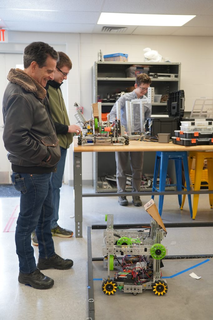 After the presentation at Community Meeting, Kamen was interviewed by members of the Derryfield robotics team, toured the robotics lab, and attended a class taught by Tom Eng, STEAM teacher, and co-coach of the robotics team.