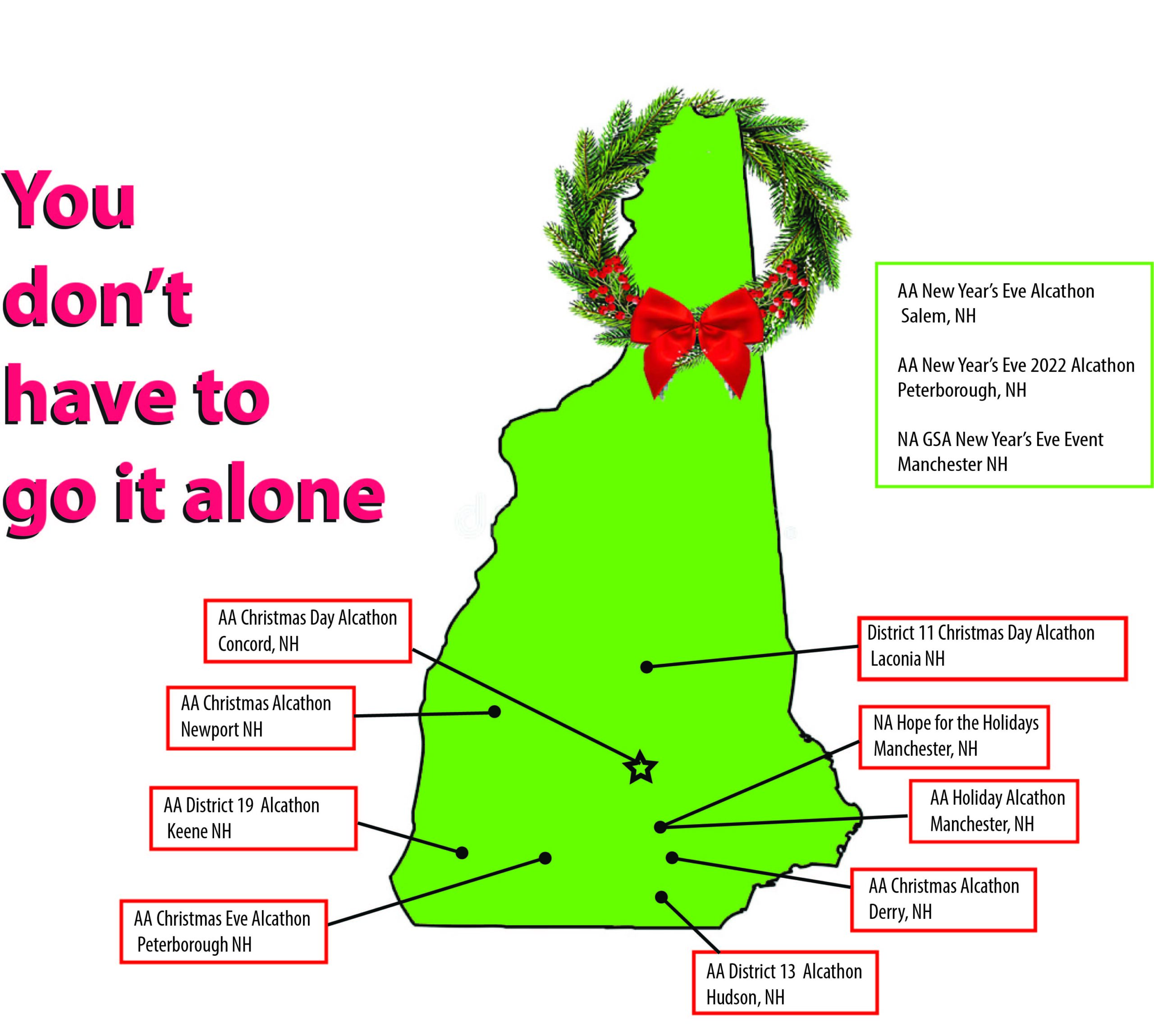 Which brings us to Christmas and New Year’s, a one-two punch filled with feelings. To a drunk, the fear of feelings doesn’t differentiate between joy and terror. When I see a bear in the woods, I don’t try to identify whether it’s black or brown, male or female, well-fed or famished—I flee. Same with feelings. The fear I hadn’t bought enough or the right Christmas presents? Drink. The painful nostalgia of childhood Christmases? Drink. The joy of watching “It’s a Wonderful Life” or “A Christmas Story”? Drink. The upcoming party to celebrate the New Year? Drink. The sense my life wasn’t adding up to anything, as evidenced by the nothing I’d accomplished looking back? Drink. The excitement of waiting for midnight? Drink. Every oncoming feeling could be avoided by drink—until I got sober. Then, like a boy raised in a bubble and released, I was faced with viral emotions and an immune system that had no way to process them. It took a few years for the holiday season to lose its ability to bat my sober gyroscope around, for me to learn how to deal with each second as it came and as it went. Luckily, for those years—and ever since—I had the emotional support of an Alcothon—first in Nashua, then in Manchester.