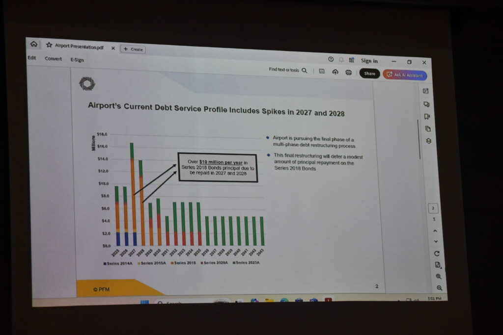 In a presentation to the Manchester Board of Mayor and Aldermen’s Special Committee on Airport Activities, Malafronte told the board that the airport is looking to modify its debt repayment schedule for 2027 and 2028 due to spikes that force the airport to repay a total of $16.5 and $14 million respectively. In comparison, the airport owes debtors just under $10 million this year and currently owes no more than $8 million after 2028, with the conclusion of a 2020 bond in 2035 dropping the debt load to just over $4 million per year in 2036.