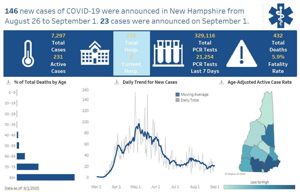 There are currently 278 individuals hospitalized with COVID-19. In New Hampshire since the start of the pandemic, there have been a total of 37,388 cases of COVID-19 diagnosed with 889 (2%) of those having been hospitalized.