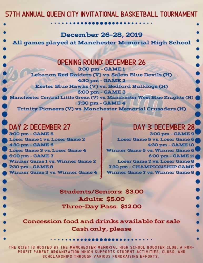 MANCHESTER, NH โ Come out and support Manchester’s teams during the 57th Annual Queen City Basketball Tournament. Tickets are $3 for students and seniors, $5 for adults and $12 for a three-day pass.