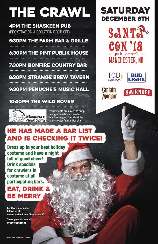 MANCHESTER, NH โ Santa has made a bar list, and heโs checking it twice โย just to make sure everyone knows whatโs on tap for Santacon 2018 โ set this year for Dec. 8.