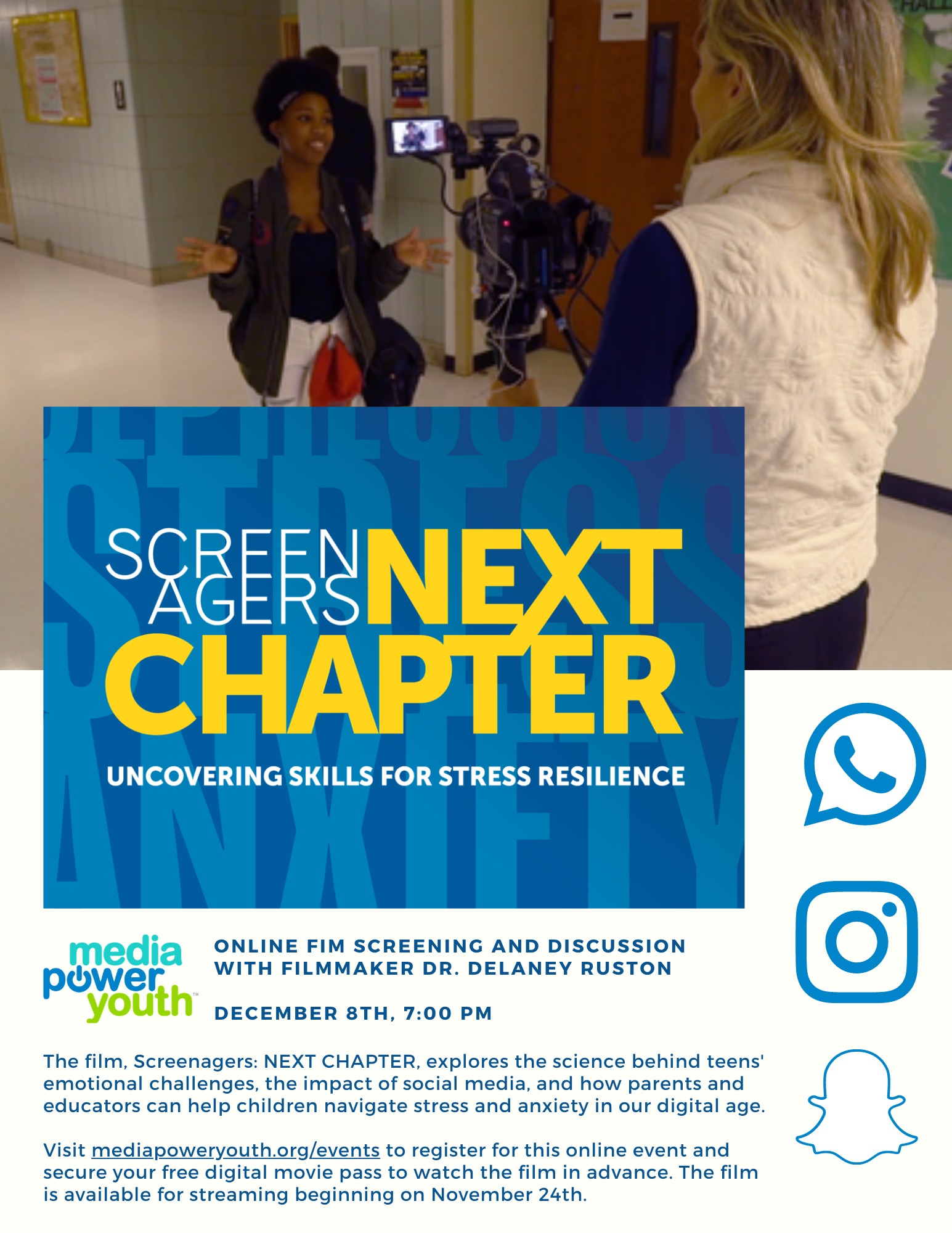 We are excited to announce that we will be hosting the creator of “Screenagers,” Dr. Delaney Ruston, for an online discussion. As a filmmaker and primary care physician, she will answer questions about the film as well as how adults can support youth in managing stress and anxiety.