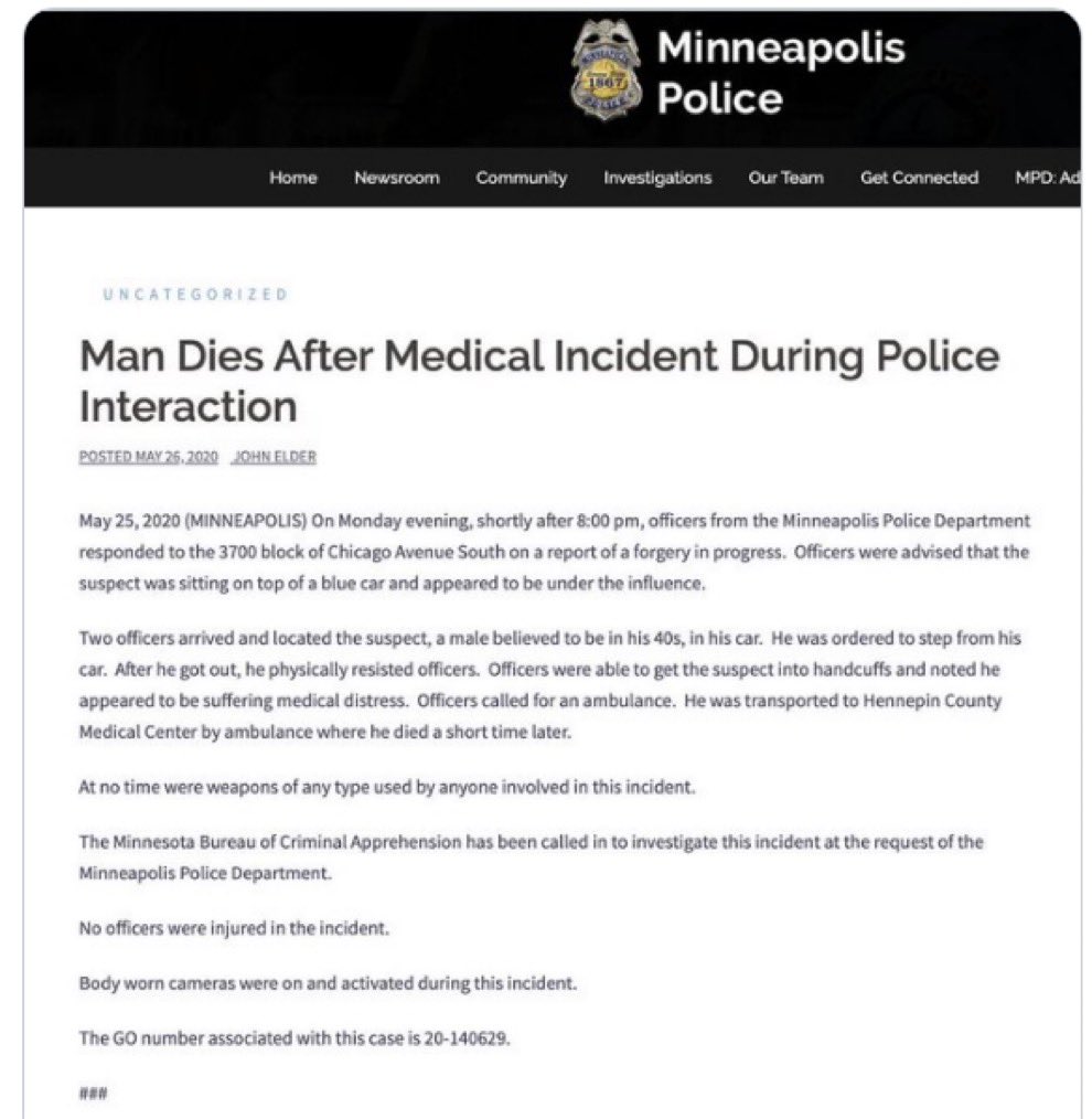 Original Minneapolis police statement issued regarding the police stop of George Floyd.