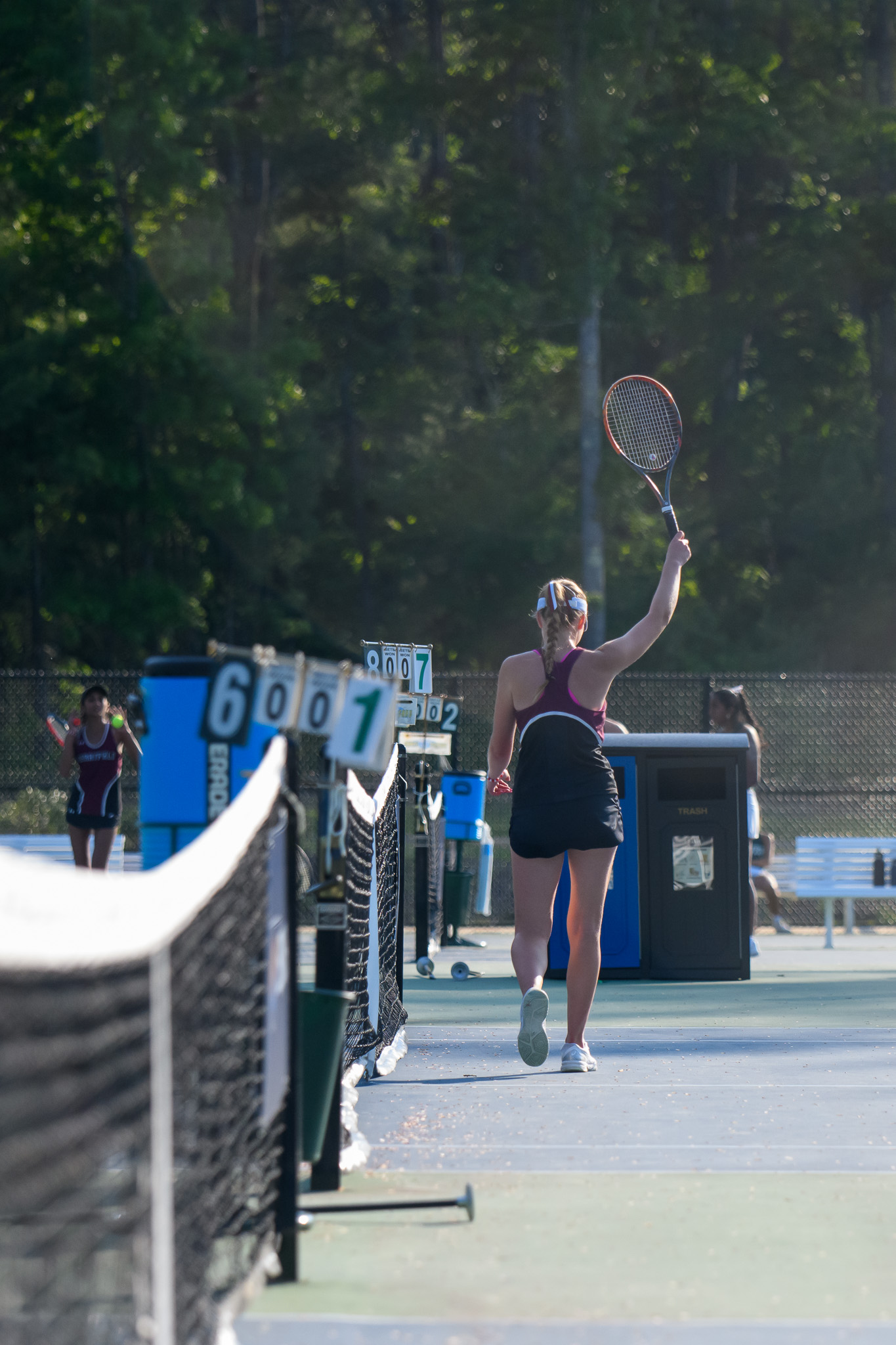 Derryfield senior captain Sophie Brown gutted out a 9-8 (5) tie-breaker victory following a medical timeout to rest and rehydrate due to Thursday’s high heat. Stacy Harrison photo