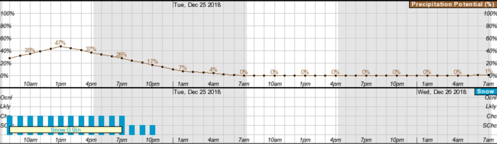 The Weather Service graph above shows that peak snow probability is around 1 p.m. today, fizzling to nothingness by the time Christmas comes to a close.