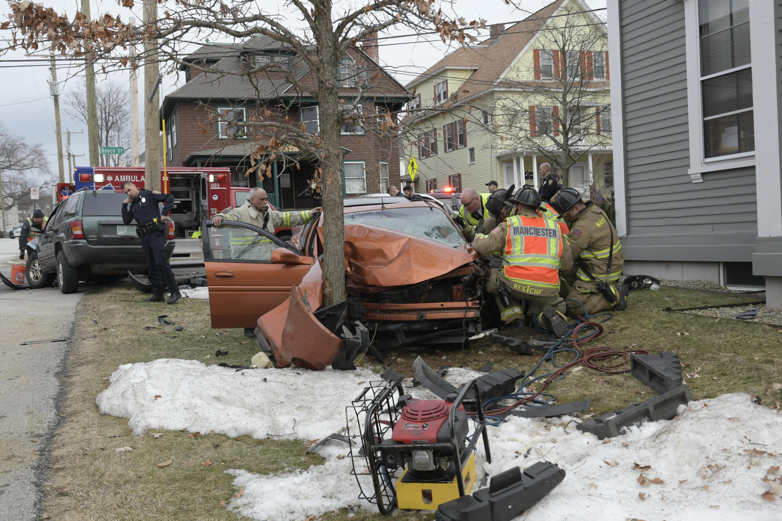 Bennett’s Jeep Cherokee struck a Pontiac Grand AM travelling South on Beech Street and caused it to spin out and flip over in the front yard of 646 Beech St. The driver of the Pontiac, Philip Stamas, 22, from Canterbury, was extracted from the vehicle by the Manchester Fire Dept.