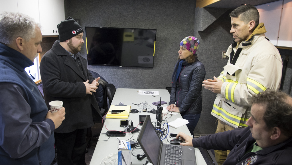 Mayor Joyce Craig and Fire Chief Dan Goonan, standing right, work together with the city’s emergency team following Sunday’s water main break. Photo/Jeffrey Hastings