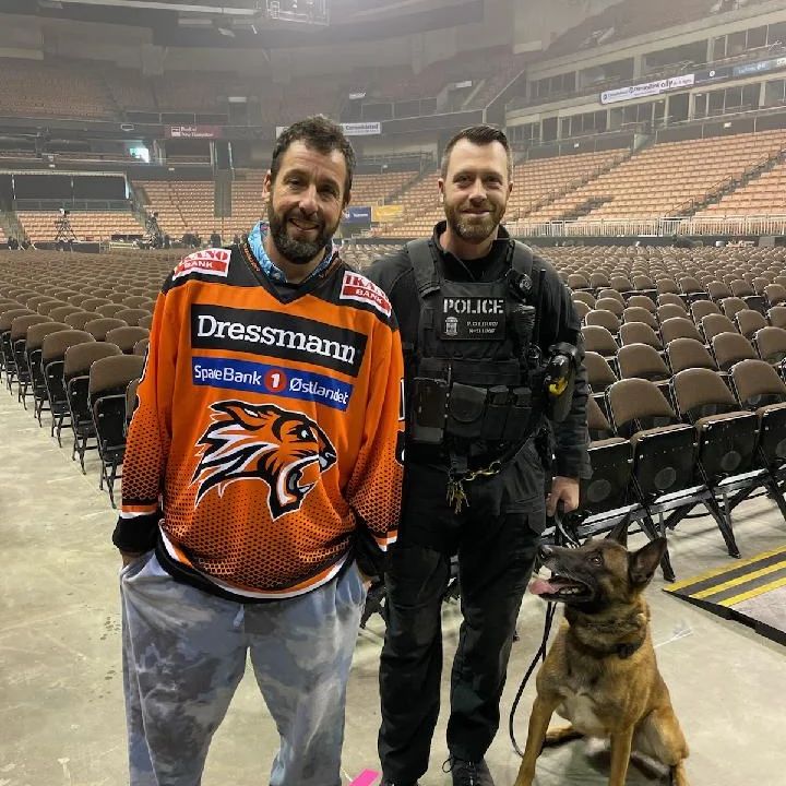 “You never know who you might run into during an EOD sweep! Manchester native Adam Sandler will be rocking the @snhuarena tonight. He took some time to meet Ofc Colburn and K-9 Duke prior to the show. Duke is waiting to hear some one-liners!! Good luck tonight Adam!!