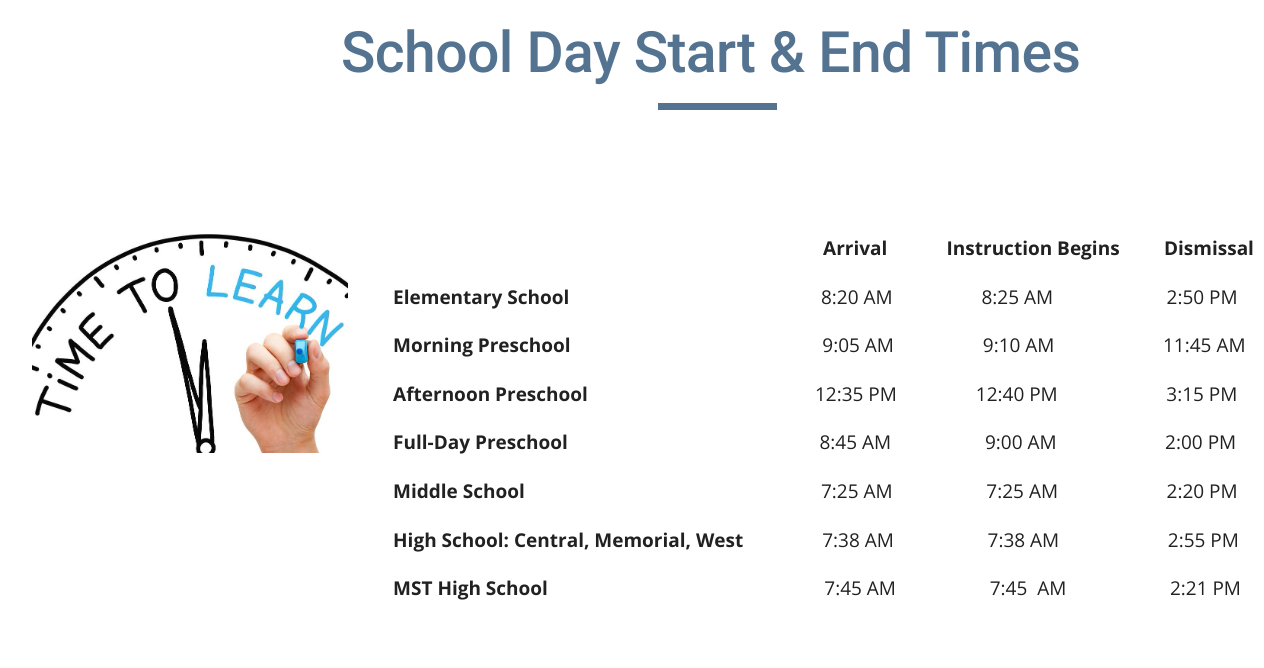 School start times have changed slightly for the new school year. According to the district, the changes are the result of the new teachersโ contract, and “will have a direct benefit on students by maximizing instructional time.”