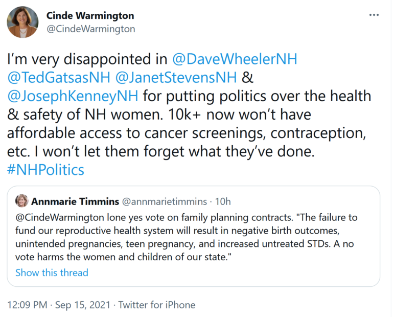 “A terrible day for the women and underserved in NH. The Executive Council, on a 4-1 vote, killed the funding for Planned Parenthood. Women’s health is jeopardized and services for men and women are eliminated. Bad day for NH.“